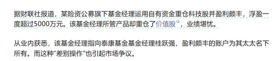 另一面是“喷发的火山”。据财联社近日报道,多方信源印证,某险资系公募基金经理利用自有资金精准重仓多只科技股、受益于过去一年AI、半导体等板块强势获数倍回报,浮盈峰值超5000万元。另据腾讯财经援引业内人士消息称,该基金经理指向泰康基金经理桂跃强,盈利颇丰的账户为其太太名下所有。
