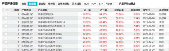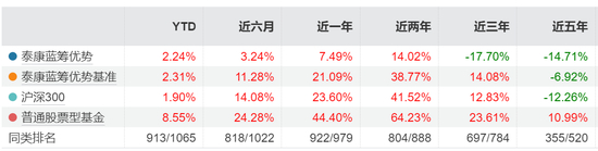 另一产品泰康蓝筹优势一年持有股票基金,2020年8月成立至今净值1.0143元,近一年、近两年收益率分别为7.49%、14.02%,近三年收益率为-17.7%,近五年收益率为-14.71%。