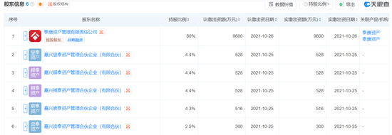 从泰康基金的股权结构来看,泰康资产出资9600万元,持有80%的股份,另外5名股东中,嘉兴舜泰资产、嘉兴祺泰资产、嘉兴昱泰资产、嘉兴宸泰资产、嘉兴崇泰资产等在内的5家员工持股平台出资2400万元,合计持有20%的股份。