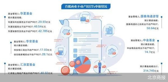 其中,华夏保利发展商业不动产REIT、华夏凯德商业不动产REIT、华夏银泰百货商业不动产REIT的预计募集规模依次为20.93亿元、40.54亿元、42.785亿元;华安锦江商业不动产REIT、华安陆家嘴商业不动产REIT预计募集规模分别为17.03亿元、28.1亿元;汇添富上海地产商业不动产REIT、国泰海通砂之船商业不动产REIT、中金唯品会商业不动产REIT预计募集规模分别为40.02亿元、50.64亿元、74.7亿元。上述8单项目预计募集规模合计为314.745亿元。