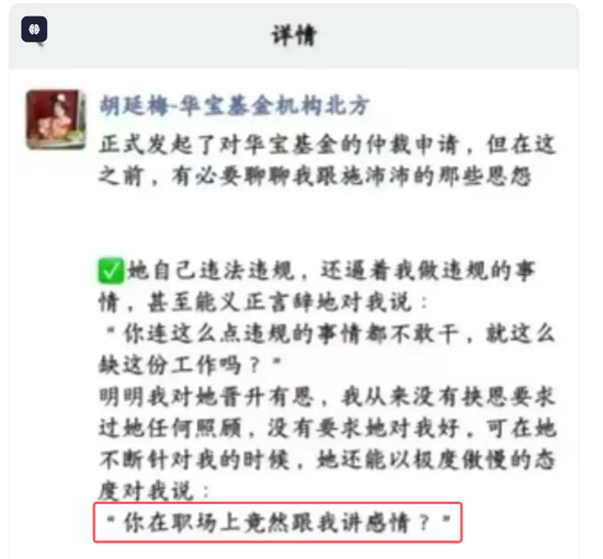 提起仲裁: 胡延梅正式向劳动仲裁委员会提交申请,起诉华宝基金,案由涉及违法解除劳动合同、职场霸凌及可能的违规操作指控。