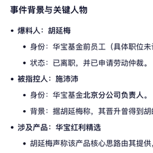被迫/主动离职: 在持续的高压管理和资源封锁下,胡延梅最终离开华宝基金。离职原因双方说法不一(公司方可能称为“个人原因”或“业务调整”,胡延梅方称为“被逼退”)。