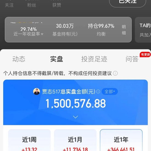 从贾志近一年的持仓动作看,2025年3月,卖出110万华夏恒生生物科技ETF联接C后,买入107万元天弘中证细分化工产业主题ETF联接C,又在4月末买入10万元该产品;到了8月减仓79%。11月又分3次买入50万元嘉实中证高端装备细分50ETF联接C,同时在当月将70万元投向货币基金,12月又将货币基金转出,买入国泰中证A500ETF联接C、嘉实国证绿色电力ETF联接C,投资金额分别为30万元、50万元,进入2026年2月,他清仓了上述产品。近一年贾志投资基金产品总计收益金额为34.65万元,其中,天弘中证细分化工产业主题ETF联接C、嘉实中证高端装备细分50ETF联接C、国泰中证A500ETF联接C、嘉实国证绿色电力ETF联接C的清仓收益分别为13.51万元、19.12万元、1.66万元、3181元。目前贾志的实盘总金额为150万元,除了持有在管基金30万元外,其余的120万元都在余额宝里。