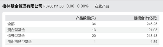 wind数据显示,目前格林基金总计在管基金数量34只,债券型20只,规模218.43亿元,占总规模的比例达89.15%,混合型13只合计规模仅21.93亿元,货币基金1只,规模4.89亿元。