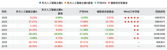 Wind数据显示,2025年,东方新能源汽车主题、东方人工智能主题分别取得62.59%、52.59%的回报率,远超沪深300的17.66%,同类排名分别为434/4411、586/4411。然而,2026年至今,东方新能源汽车主题回报率为-3.88%,同类排名3800/5074;东方人工智能主题则保持稳健,回报率9.23%,同类排名466/5074。