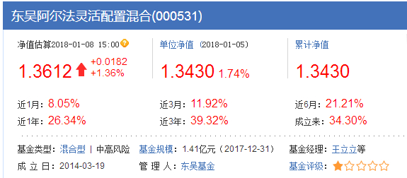 东吴阿尔法灵活配置和长安产业两只基金均成立于2014年,两者近3年来的净值估算分别为39.32%和40.89%。虽然金元顺安新经济成立于2012年,但是其近一年来的净值估算为27.38%,而同期东吴阿尔法和长安产业分别为26.34%和30.74%。我们可以看到2017年至今,三只基金在每一个阶段的业绩高度相近,然而之前的两年每年都有巨大的差异,一年最多相差50个百分点。