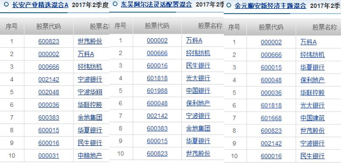 根据2017年9月30日公布的股票持仓数据,金元顺安新经济主题、东吴阿尔法灵活配置、长安产业精选混合同时持有:华帝股份、美的集团、小天鹅A、万科A、格力电器、经纬纺机、华联控股、青岛海尔、信达地产、万华化学这十只股票。