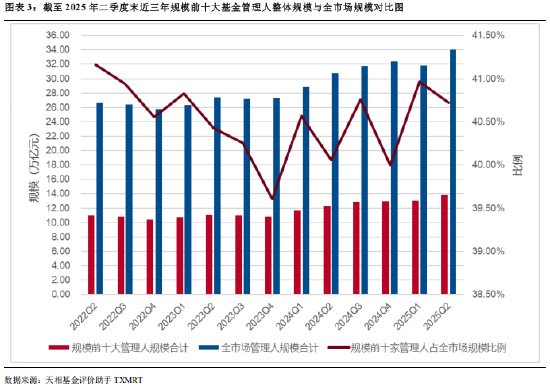 截至 2025 年二季度末,规模前十大管理人规模合计13.86 万亿元,全市场基金管理人规模合计34.05 万亿元,规模前十大管理人规模占比为 40.72%,占比较上季度末减少 0.24 个百分点。近三年,前十大管理人合计规模占比整体呈现下降趋势,然而近一年半占比有所回升。