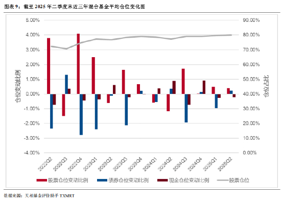 2025年二季度,全市场混合基金股票平均仓位较上期增加0.41个百分点,由上季度的79.56%上升至79.96%;债券平均仓位较上期增加 0.22 个百分点,由上季度的 11.39%增加至 11.61%。本季度 A 股行情实现 V 形反转,混合基金继续保持高股票仓位运作。