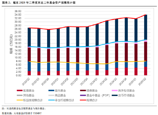 公募整体规模方面,截至 2025 年二季度末,公募基金整体规模 34.05 万亿元,较 2025 年一季度末规模 31.81 万亿元增长 7.04%;