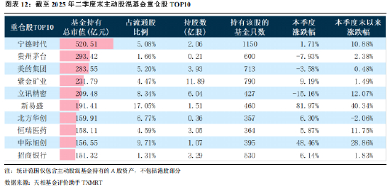 截至 2025 年二季度末,主动股混基金(包含天相一级分类中股票基金和混合基金,且不含指数型基金,下同)的重仓股 TOP10 如下表所示,宁德时代排名榜首,贵州茅台第二、美的集团第三。