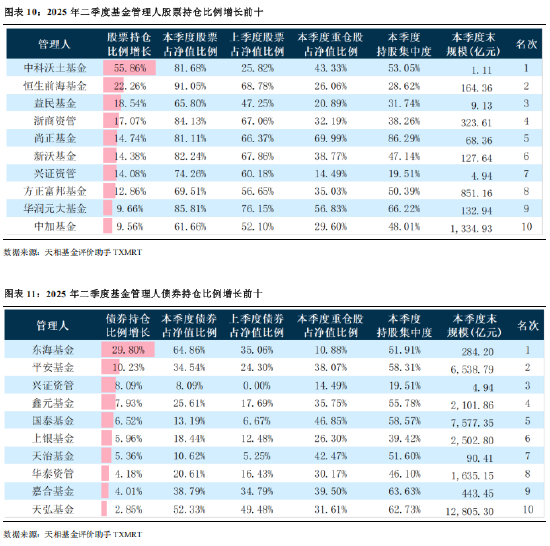 从基金管理人角度看,中科沃土基金、恒生前海基金、益民基金、浙商资管、尚正基金、新沃基金、兴证资管、方正富邦基金、华润元大基金、中加基金,增加了股票的持仓比例;东海基金、平安基金、兴证资管、鑫元基金、国泰基金、上银基金、天治基金、华泰资管、嘉合基金、天弘基金,增加了债券的持仓比例。