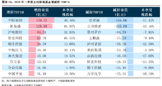 2025 年二季度,主动股混基金增持前三是中际旭创、新易盛和沪电股份,增持市值分别为 139.72、128.88和 84.53 亿元;减持前三是比亚迪、立讯精密和贵州茅台,减持市值分别为 165.06、105.09 和 84.59 亿元。从二季度涨跌幅来看,增持 TOP10 股票全部上涨,其中新易盛、胜宏科技、中际旭创和信立泰的涨幅超过 45%;减持 TOP10 股票全部下跌,其中万华化学、山西汾酒和立讯精密的跌幅超过 15%。