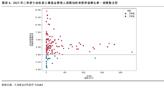 从全市场角度看,大部分主动权益公募基金管理人在 2025 年二季度实现正收益,规模加权季度净值增长率在 -5%到 15%之间,规模较大的管理人集中分布在 2.5%左右。
