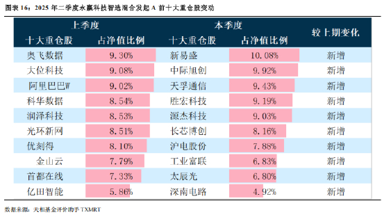 由上表可知,二季度永赢科技智选混合发起 A 前十大重仓股变动较大,全部为新增,排名前三位的新易盛、中际旭创和天孚通信占净值比分别为 10.08%、9.92%和 9.43%。