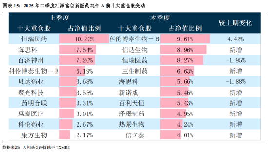 由上表可知,二季度汇添富创新医药混合 A 前十大重仓股变动较大,有 7 只为新增,排名前三位的科伦博泰生物、信达生物和恒瑞医药占净值比分别为 9.61%、8.96%和 8.27%。