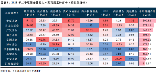 ⚫ 管理人利润方面,2025 年二季度,华夏基金、易方达基金、广发基金本期利润合计排名前三,分别为 300.92 亿元、276.13 亿元、249.77 亿元;