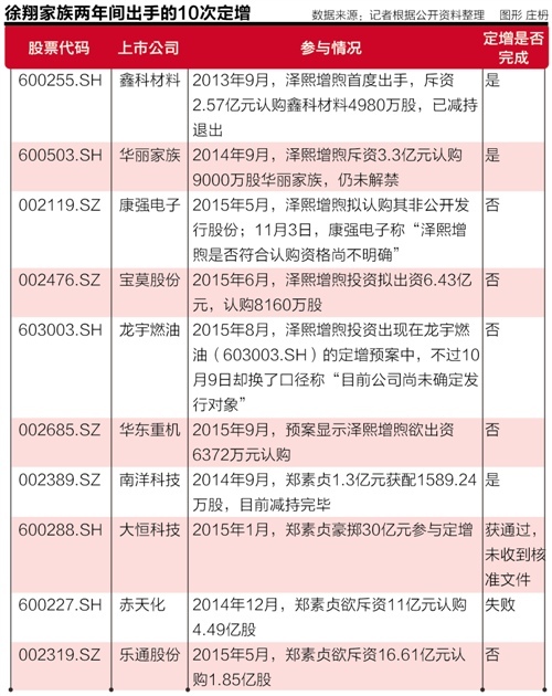 据21世纪经济报道记者统计,短短2年间,徐翔家族通过上海泽熙增煦投资中心(有限合伙)(下称泽熙增煦投资)这一平台和郑素贞个人这一平台快速接入10家上市公司的定增。