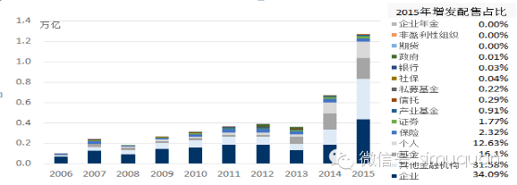 近几年,市场增量主要来源于上市公司的定向增发,从定向增发的配售对象进一步分析,企业是定向增发的主要配售方,因此一般法人的持股市值得以进一步提高。以2015年为例,A股增发配售中有34.09%流向企业,超过三分之一。另外有31.58%流向其他金融机构,这里的其他金融机构主要是指财务公司、创业投资公司、贷款公司、担保公司、金融控股集团等,并非传统意义上所说的证券、保险等专业金融机构投资者。