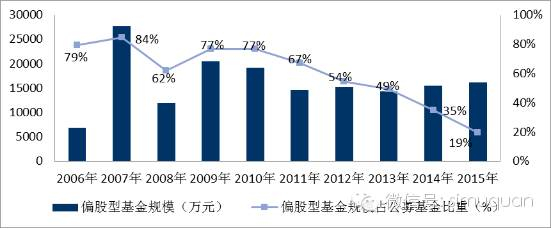 即使公募基金总体规模到2015年底达到了7.2万亿,但货币基金占比在一半以上,成为公募基金产品的主力;股票型基金产品占比仅为8.39%,在整体基金规模中占比相对较小。若再计入其他基金产品中的偏股类产品规模,总体而言,截至2015年,偏股型基金规模约为1.61万亿元。回顾2007-2015年的市场发展来看,这一比例呈现持续下降,从2007年最高时的84%下降到2015年的19%,降幅高达65%。