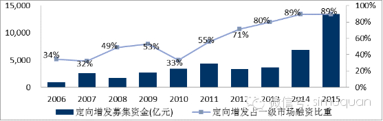 从增量的角度来看,增发占据了近几年股票发行的主要规模,而其中绝大部分都是定向增发。A股市场上市公司增发股票募集资金主要通过定向增发,截至2015年,市场定向增发募集资金共13452.34亿元,占增发规模的100%,占一级市场融资规模比重为89.25%。