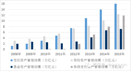 回顾公募基金近年的发展,2009-2011年,基金管理规模出现了持续的萎缩,资产管理规模由2009年的2.67万亿减少到2011年的2.13万亿。2012年后,受益于泛资管时代的到来,公募基金总体规模增长较快,到2015年底达到7.2万亿(不含基金子公司的资产管理规模),但与其他资产管理机构相比发展明显缓慢。同期,信托、保险、券商管理规模分别为16.3万亿、12.36万亿、11.89万亿。尤其与起步较晚的证券公司资产管理相比,基金资产管理规模增长乏力。