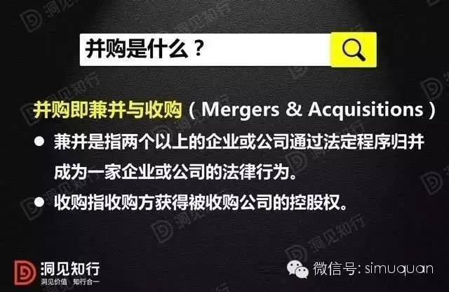 并购即兼并与收购(Mergers & Acquisitions),兼并是指两个以上的企业或公司通过法定程序归并成为一家企业或公司的法律行为,严格地说,它有新设兼并和吸收兼并两种形式。前者为有关的两家公司合为一家公司,原公司的注册被注销,各自原有的独立法人地位消失,合并后的新公司重新进行注册,出现一个新的法人,其实质是平等的结合;后者也是两家公司合为一家公司,但一方为吸收方,一方为被吸收方,合并后吸收方独立法人地位不变,被吸收方的注册被注销,其独立法人地位消失,其形式有以大吃小、以强吃弱、以快吃慢,有时也有以小吃大的情况,但其实质是“吃”。而收购的含义是指收购方获得被收购公司的控股权。