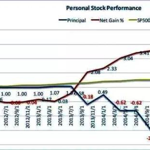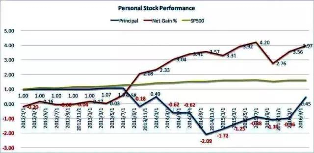 由于一级市场的投资有很多保密义务,我想主要用我个人的股票投资来做例子。首先看一下我的股票投资业绩图。下图中红色线的是 “净利润”,蓝色线是我的本金的变化,另外我还加了一个绿色的 “标普 500 指数线” 用做业绩比较基准。