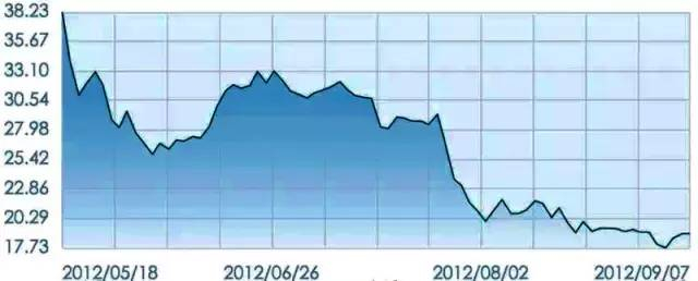 Facebook上市的时候是 38 美金左右一股,很多做风险投资的朋友都买了它的股票。不过它第二天就跌破了发行价,接下来一路狂跌,最低跌到过 17.7 美金。见下图: