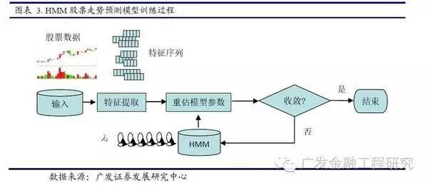 基于HMM模式识别模型的股市走势预测:首先,按照事先分类,选取历史上属于同类走势的日期以及该日期之前若干个星期的股票数据,提取股票数据中某些特征指标(成交价格,成交量,等等)形成相应的序列作为模型的输入,并应用Baum-Welch算法对各类模型进行训练,训练过程如下图: