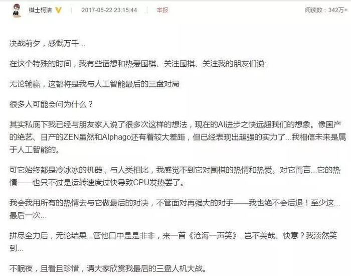 昨晚在决战前夕,柯洁在微博中写到: