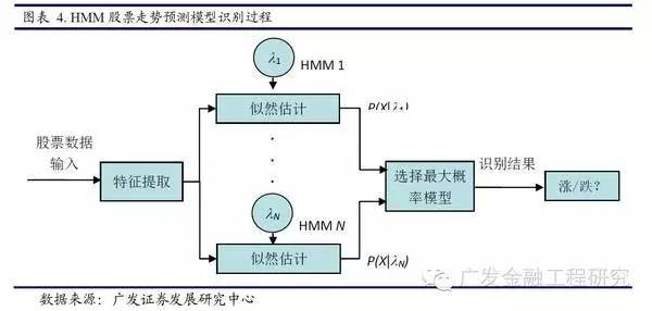 其次,根据训练好的HMM模型,选取若干个星期的股票特征指标(成交价格,成交量,等等)序列作为输入,应用向前-向后算法计算各个模型发生的概率,选取最大概率对应的模型,从而得到下一阶段股票走势的识别结果。识别过程如下图: