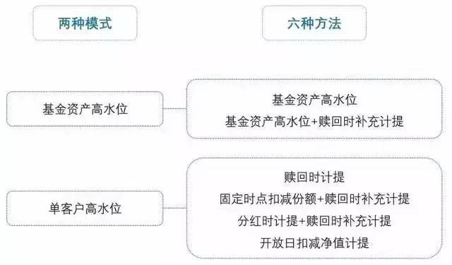 两种模式为基金资产高水位模式和单客户高水位模式。在基金资产高水位模式中,根据计提时点的不同分为基金资产高水位方法和基金资产高水位+赎回时补充计提方法;在单客户高水位模式中,根据计提时点和扣减形式的不同,分为赎回时计提方法,固定时点扣减份额+赎回时补充计提方法、分红时计提+赎回时补充计提方法以及开放日扣减净值计提四种。