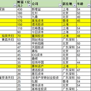 此外,股权私募中,同创伟业的郑伟鹤、黄荔夫妇则身家53亿元,真格基金的徐小平身家45亿元,基石资本的张维身家达26亿元等等,这里基金君就不一一介绍了。