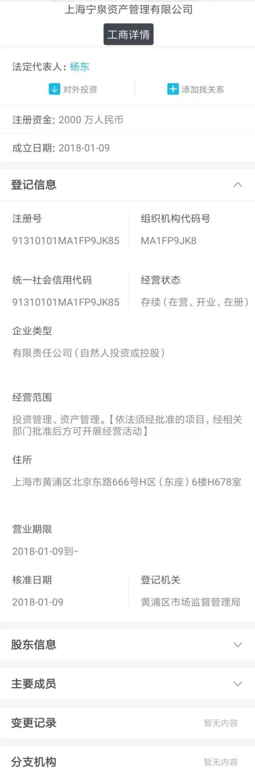 启信宝信息显示,上海宁泉资产成立于2018年1月9日,注册资金为2000万元,经营范围是投资管理、资产管理,主要进行二级市场的投资,法定代表人杨东。