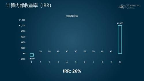 假设我们看中一个投资项目,投入100元购入创业项目的股权。10年以后,项目成功上市,在7年前投入的100元上涨了10倍,变成了1000元。根据这些条件,我们可以计算得出,该投资的IRR为26%。