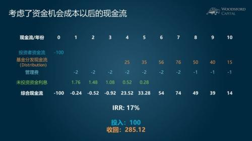 享有安全性和高流动性的代价,就是牺牲这部分资金的投资回报。现在我们假设那部分准备好的承诺资金从短期债券中可以获得2%的年投资回报,再来算一下投资者的真实IRR。