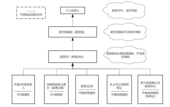 话不多说,两张示意图快速弄清契约型和有限合伙型基金的缴税概况,具体细节在后文展开分析。