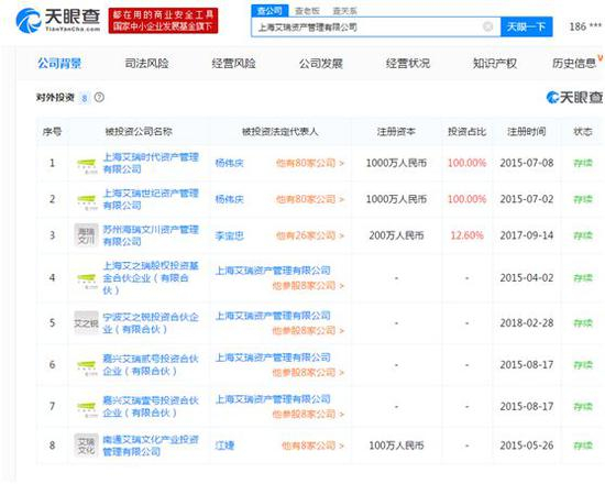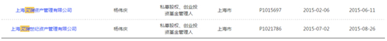 杨伟庆拥有上海艾瑞世纪资产管理有限公司、上海艾瑞资产管理有限公司,这两家公司在基金业协会均已取得备案,类型登记为股权投资基金。