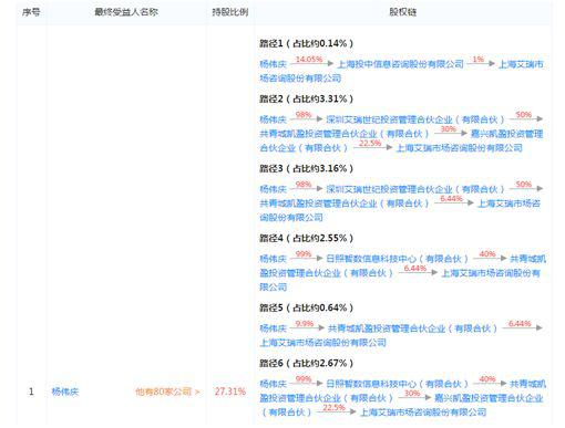 根据天眼查的工商信息显示,艾瑞咨询的直接股东有44家之多,而杨伟庆通过参股或控股十几家公司,进而实现对艾瑞咨询的持股。为什么要通过如此复杂的股权结构入主艾瑞咨询,也着实奇怪。
