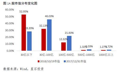尾部公司估值不断下移,今年以来A股市场剧烈调整,尾部公司估值不断下移,30亿以下的股票占比增多,截止2018/10/19,A股市值在30亿元以下的公司已有1882家,占比从去年底的28%上升至53%,前20%的股票市值占总市值的79%,这一比例逐步向港股靠拢。