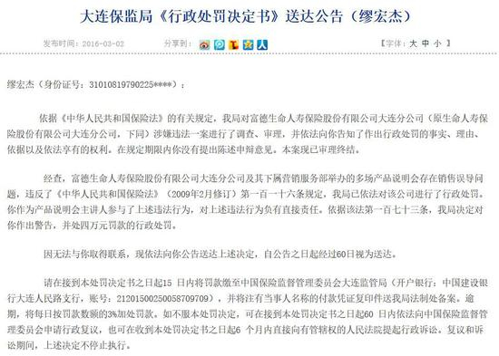 大连保监局2016年的一份行政处罚决定书显示,缪宏杰曾为富德生命人寿大连分公司副总经理。2015年曾因涉嫌违法销售行为,被大连保监局处以警告并罚款四万元。知情人士透露称,在收到这张罚单后,缪宏杰离开了生命人寿,并与朋友成立了东方成安,任总裁。
