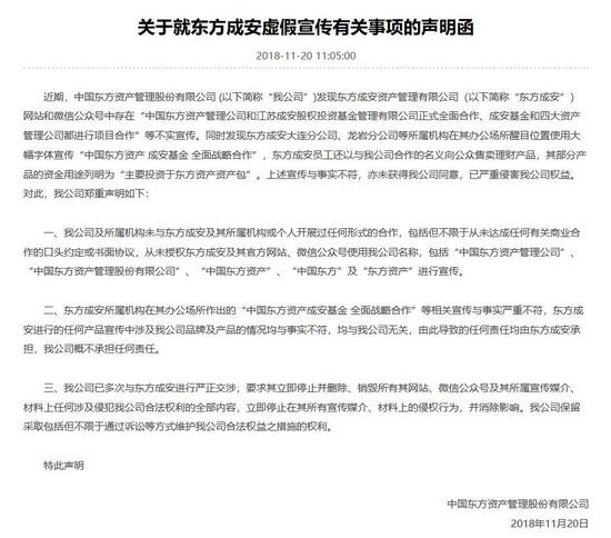然而此声明发布的第二天,东方成安便被东方资管“打脸”。11月20日,东方资管官网挂出的声明函表示:东方成安虚假宣传。