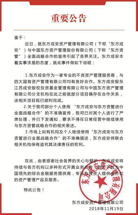 另外,东方成安官网还挂出一份今年11月19日发布的重要公告。公告主要是对网传的东方成安与四大AMC之一的东方资管全面战略合作的宣传进行说明。东方成安表示,本着实事求是的态度,其与四大国有资产管理公司均有良好合作。