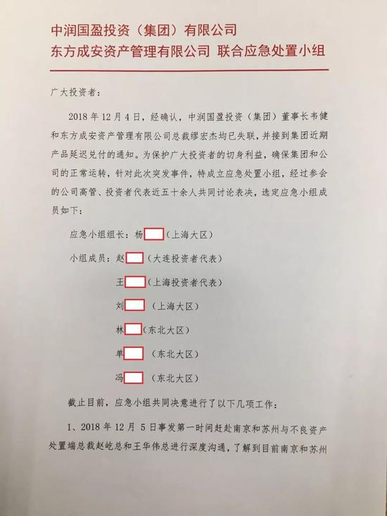 为保护投资者利益,确保公司正常运转,东方成安和中润国盈联合应急处置小组成立。12月5日,成立后的应急小组第一时间赶赴南京和苏州与不良资产处置端负责人进行沟通。