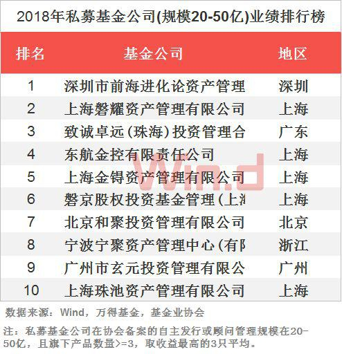 管理规模20-50亿的私募中,前海进化论资产位居第一,磐耀资产、致诚卓远投资分列第二、第三位,三家平均回报达31%。从地区分布来看,主要还是集中在上海。