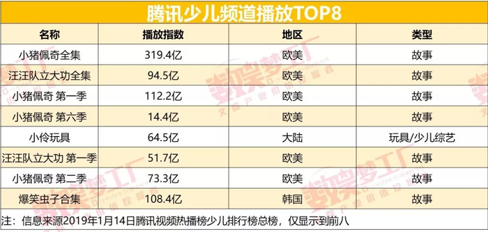 相比之下,腾讯视频的用户更偏爱进口的“故事”类型节目。腾讯视频少儿频道热播榜单前8中,7部作品来自欧美和韩国出品的剧情类动画。