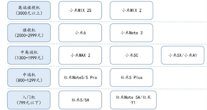 2015年,小米推出了小米手机中的新一系列产品——小米 note。16年起,小米便专注于低端品牌,先后推出了小米 5、小米 5S 和小米 5s plus ,但随着华为、OPPO 等品牌的强势增长,小米手机出货量陷入低迷,呈现下降态势。