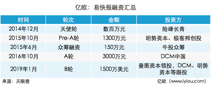据亿欧了解,易快报成立于2014年底,能为企业提供企业订购、报销管理、费用控制等一体化的SaaS产品及服务。员工通过易快报可以随时随地记录消费、提交报销,管理者也可随时移动审批,查看多维度报表,实时掌握企业财务支出状况,并且通过接入钉钉、滴滴、用友等第三方应用,还能实现从订购到报销的一体化流程。截至今日,易快报已完成5轮融资,详情如下:
