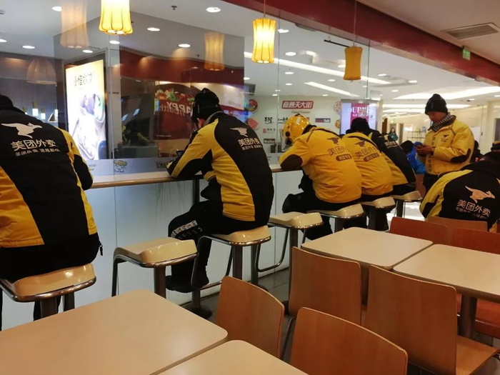 在跟燃次元聊天时,他正坐在一家餐厅内玩着手机。此时下午四点半。在餐厅的另一角,坐了一排身着黄色外卖服的配送员,有的玩起手机,有的趴在桌子上休息。